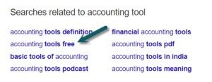 - Mejore su CTR: según las búsquedas relacionadas, puede modificar su Meta Título y Meta Descripción para que coincidan con lo que sus usuarios están buscando y aumentar el CTR. Por ejemplo, si buscamos “herramienta de contabilidad”, estas serán las búsquedas relacionadas: