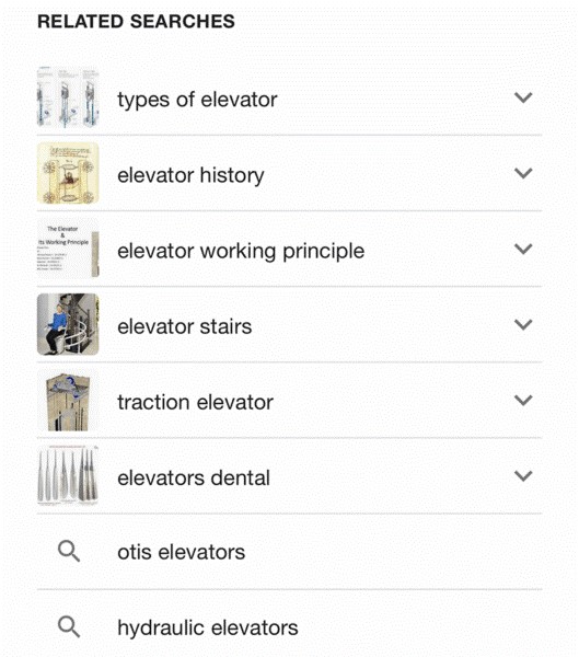 En diciembre del año pasado, Google lanzó una actualización del algoritmo para dispositivos móviles para mostrar imágenes en miniatura de algunas de las búsquedas relacionadas. Este es un ejemplo: